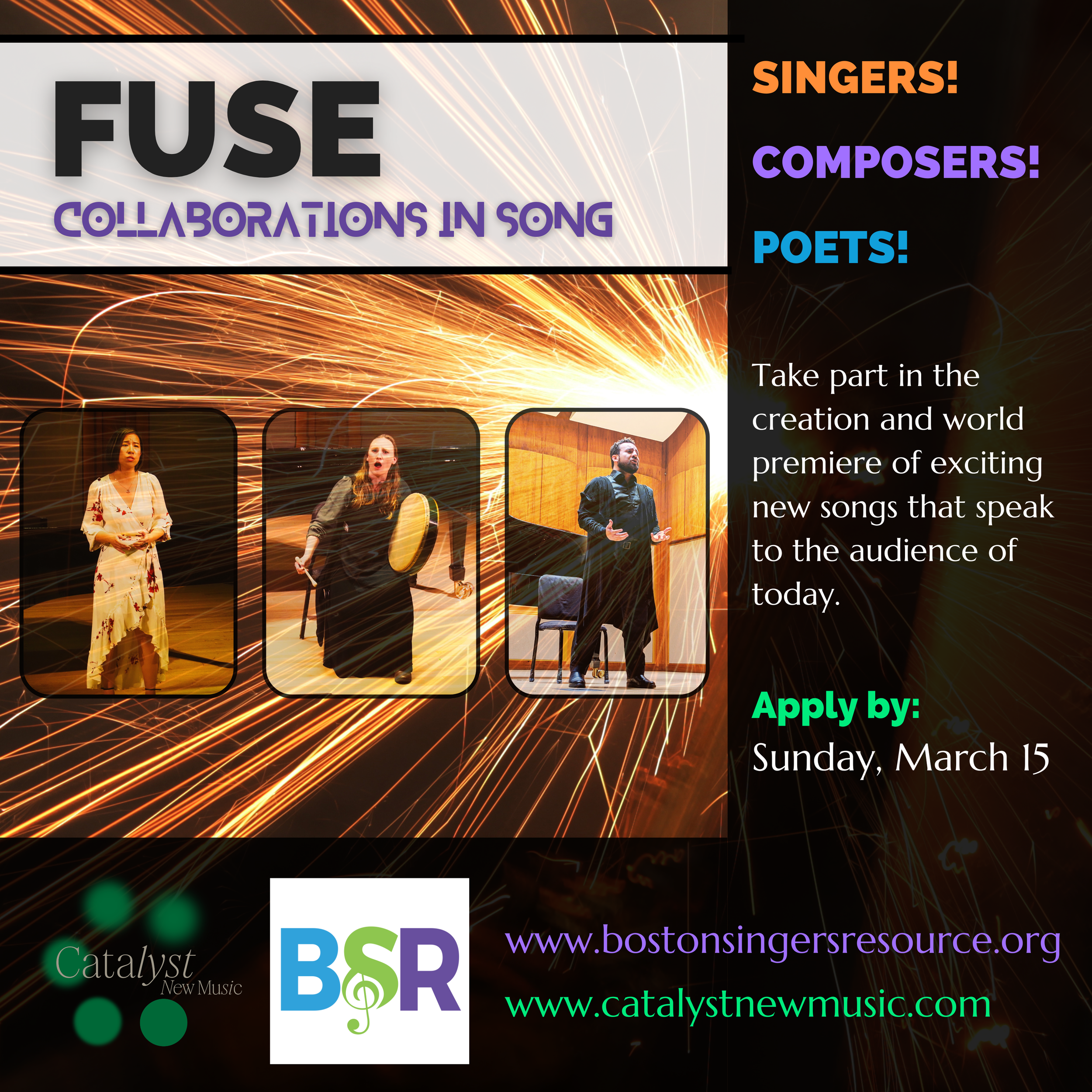 FUSE: Collaborations in Song is a co-production of Catalyst New Music & Boston Singers’ Resource, both 501(c)3 nonprofit organizations in Massachusetts. The program is administered by Brendon Shapiro, Co-Artistic Director of Catalyst New Music and former Artistic Director of Boston Singers’ Resource, Ryan Mewhorter, Executive Director of Boston Singers’ Resource, and Omar Najmi, Co-Artistic Director of Catalyst New Music, with additional support from the staff and board of both organizations.